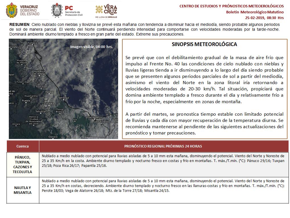 El viento del Norte continuará perdiendo intensidad para comportarse con velocidades moderadas por la tarde-noche. Dominará ambiente diurno templado a fresco en gran parte del estado.