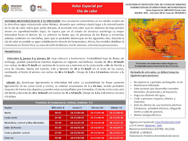 Miércoles 8, jueves 9 y viernes 10: muy caluroso a bochornoso. Probabilidad baja de lluvia; sin embargo, pueden presentarse eventos dispersos en regiones montañosas. Surada de 20 a 30 km/h con rachas de 60 a 75 km/h en sectores de la zona sur y menores en la costa norte, valle de Perote y zona de Orizaba. Viento del Sureste, Este y Noreste de 20 a 35 km/h en el resto de las costas, cambiando al Norte el viernes con rachas de 40 a 55 km/h . Oleaje de 1.0 a 2.0 metros cercano a la playa.