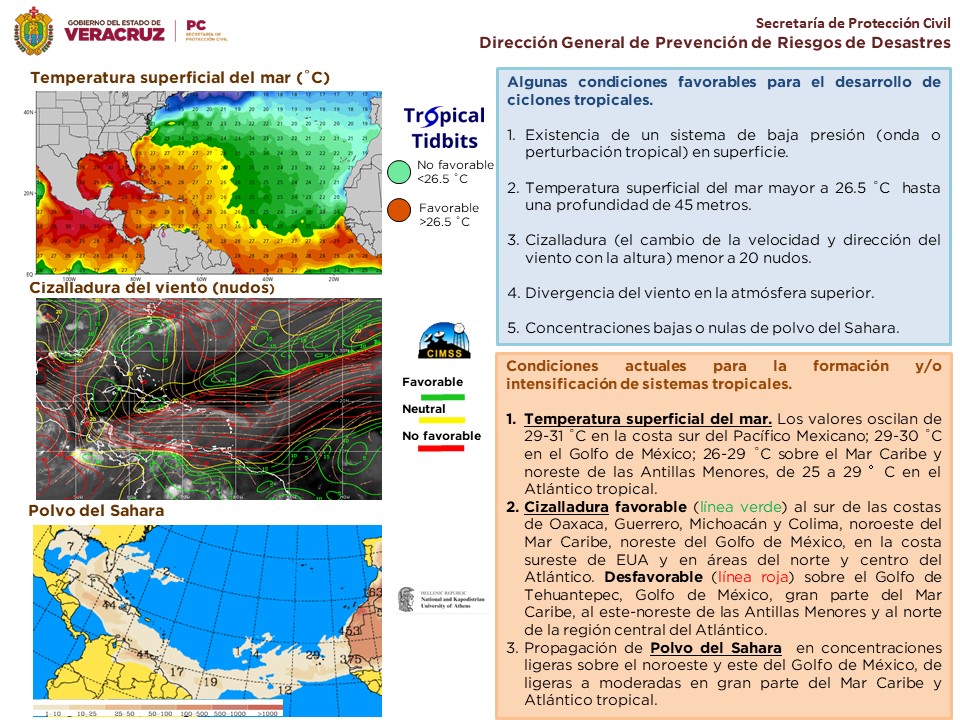 SISTEMAS METEOROLÓGICOS Y SU PREVISIÓN: En los próximos días se espera continúe el aumento del potencial para lluvias y tormentas en el estado de Veracruz debido al fuerte flujo de humedad de ambos océanos generada por sistemas de baja presión en regiones del Golfo de México, Pacifico Oriental y noroeste del mar Caribe, así como el posible desarrollo de un Giro Centroamericano este fin de semana y con movimiento hacia el sureste del país, todo esto apoyado por la persistencia de la divergencia del viento en la atmósfera superior. Además, se prevé ambiente ligeramente menos cálido al mediodía y durante la tarde.